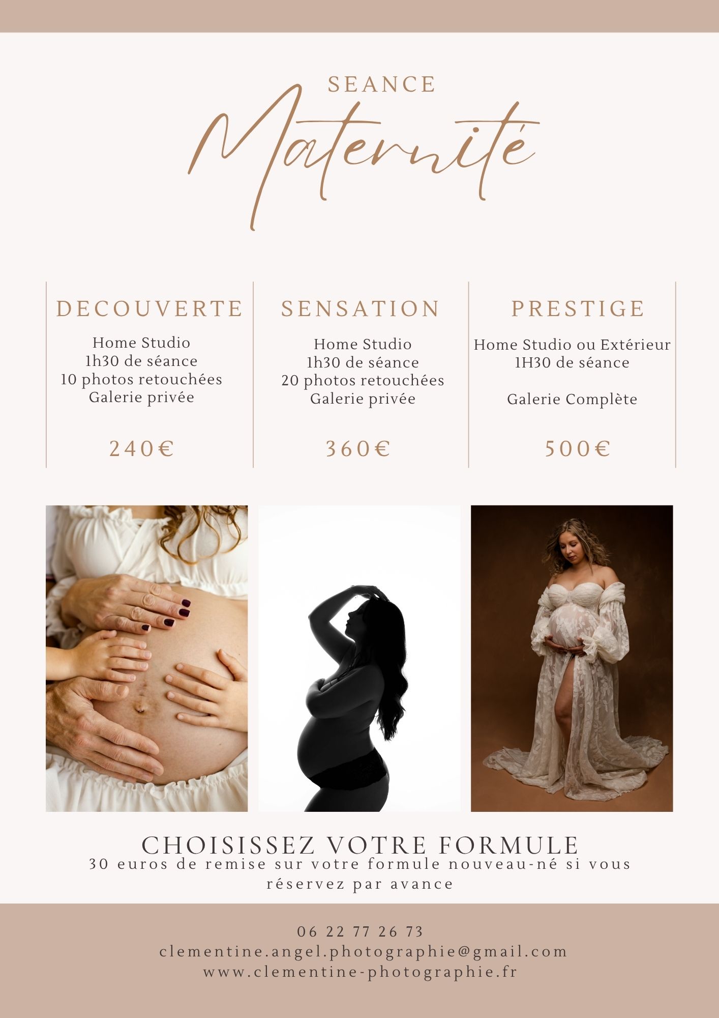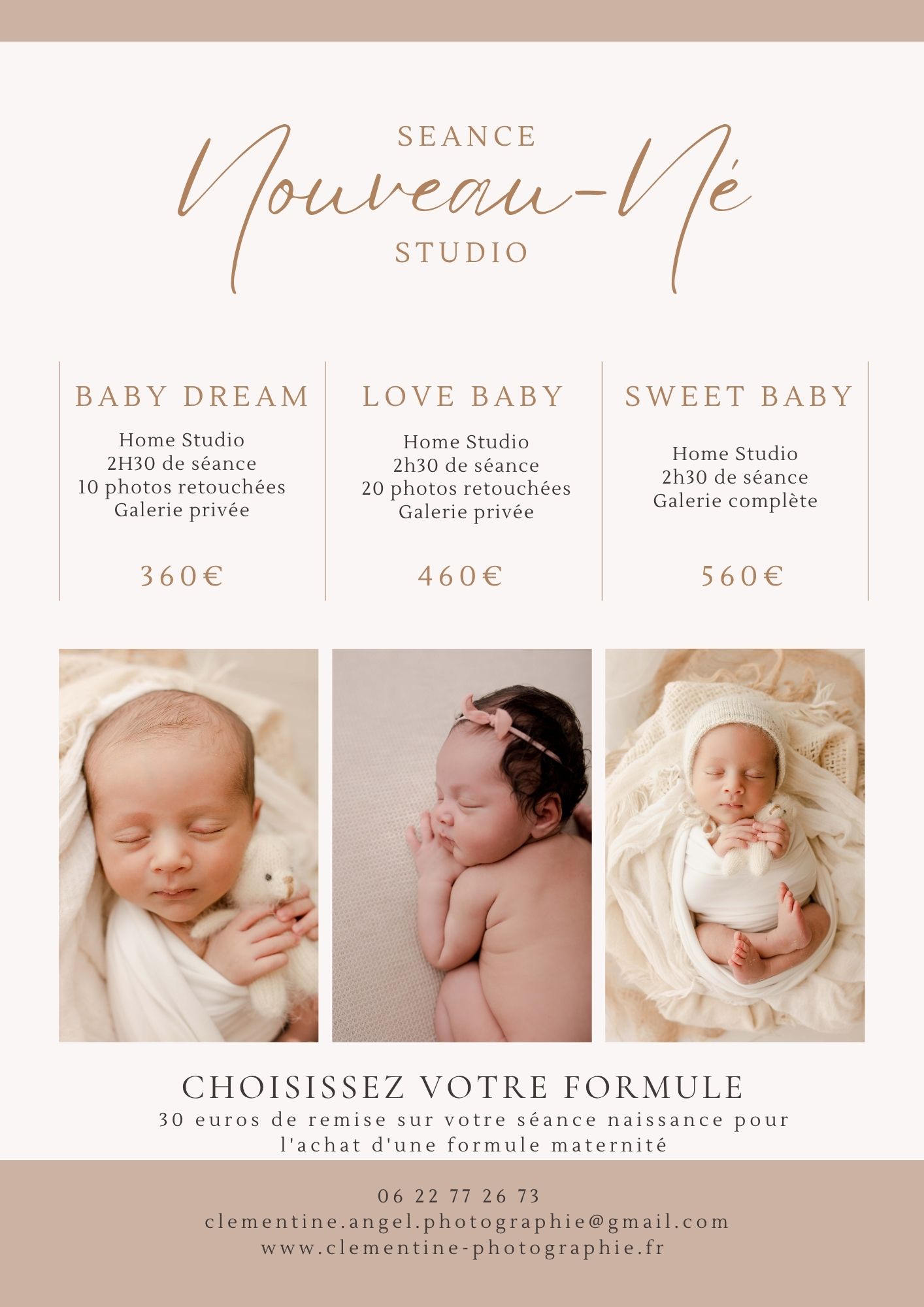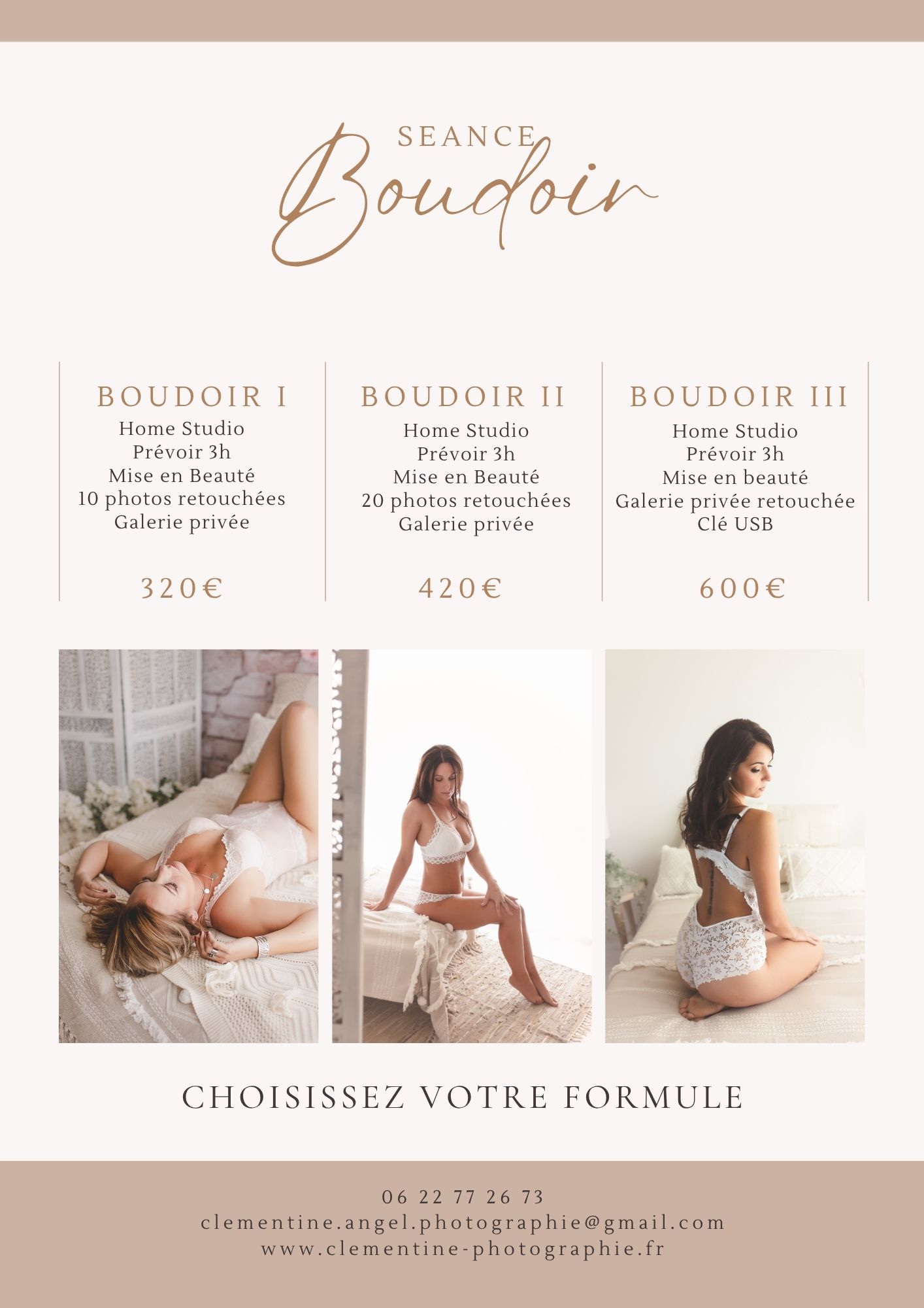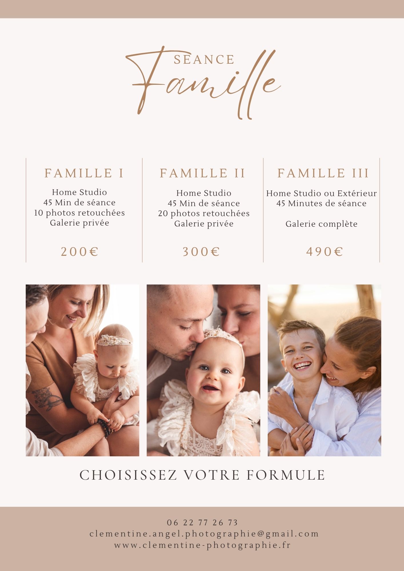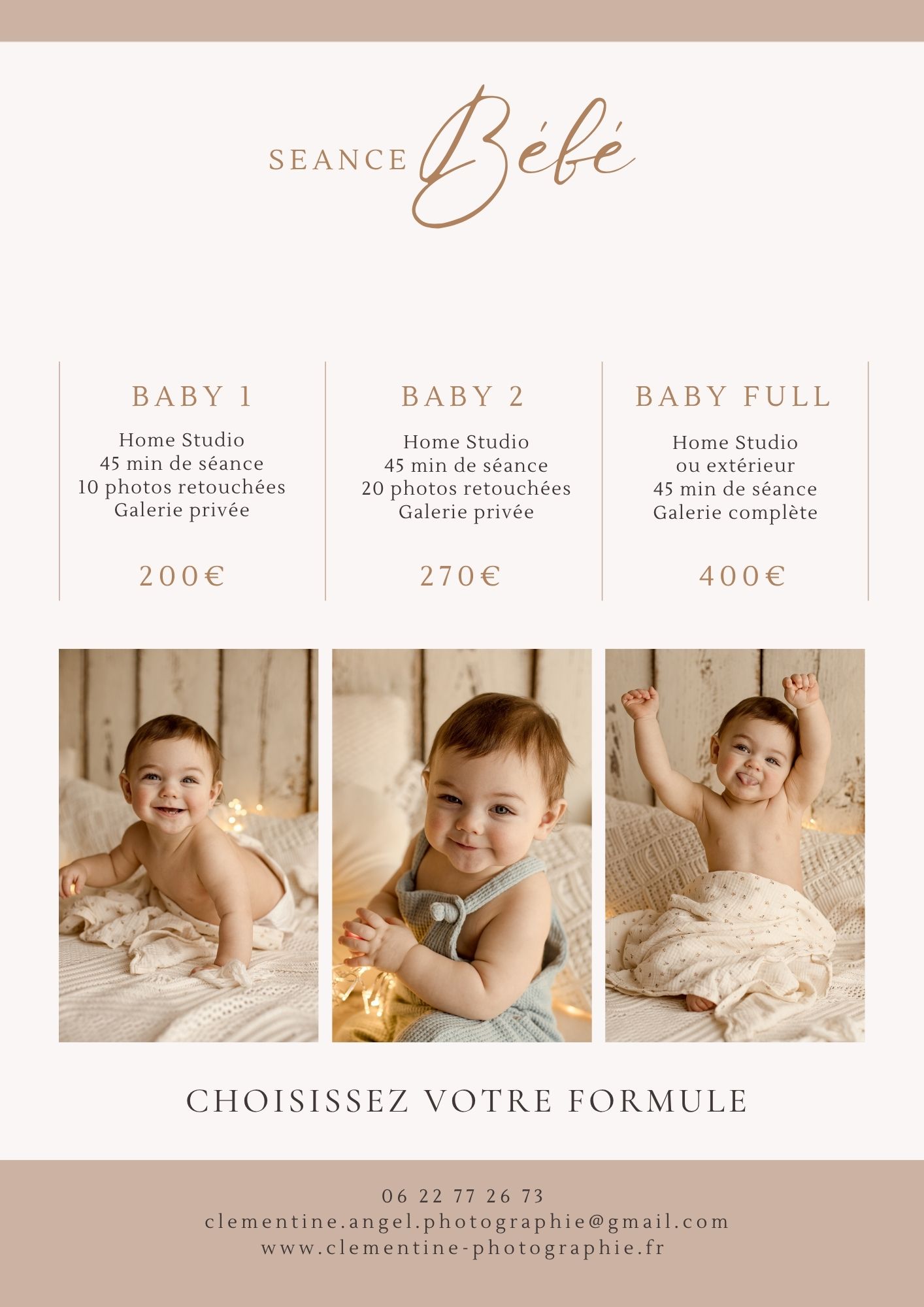 Vous trouverez ci-dessous toutes les informations concernant le budget de votre séance photo. Le tarif , le nombre de photos, le temps de séance.